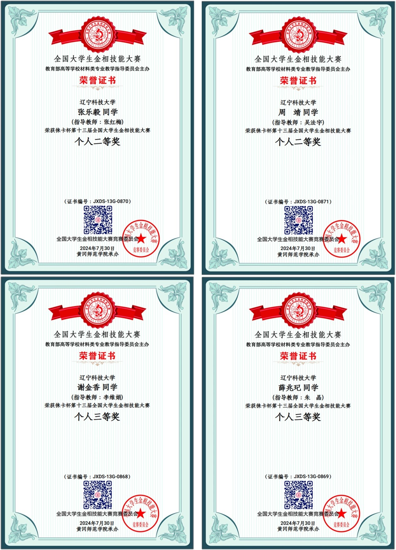 7月25日至30日,由教育部高等学校材料类专业教学指导委员会主办、黄冈师范学院承办的第十三届全国大学生金相技能大赛决赛在湖北黄冈举行。本次大赛分校内预赛、分区赛复赛和全国总决赛三个阶段。来自清华大学、上海交通大学、北京科技大学等531所大学的1898名选手同台竞技。经过多天激烈的角逐,完美(中国)材冶学院学子凭借严谨的实验素养和沉着的竞技状态,最终荣获二等奖2项,三等奖2项。