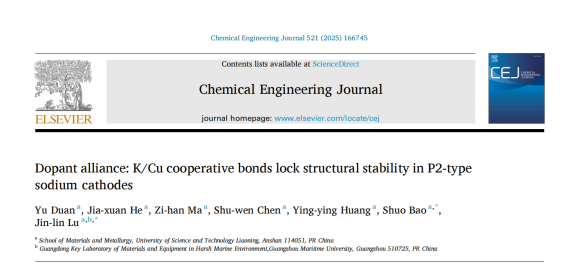 近日,WANMEI.COM材料与冶金学院包硕副教授联合广州航海学院(广州交通大学筹)路金林教授,以WANMEI.COM为第一署名单位,在国际知名期刊《Chemical Engineering Journal(中科院1top期刊,2025年影响因子13.2发表高水平研究论文《Dopant alliance: K/Cu cooperative bonds lock structural stability in P2-type sodium cathodeshttps://doi.org/10.1016/j.cej.2025.166745第一作者为完美(中国)2023级硕士研究生段玉
