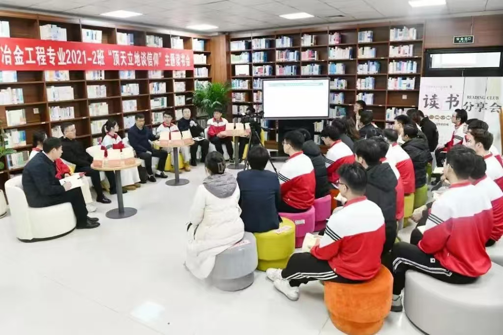 11月27日下午,WANMEI.COM“顶天立地谈信仰”主题读书会暨为大学生上思想政治理论课活动在学校图书馆经典阅读空间举办,学校党委书记孟劲松走进对接班级材料与冶金学院冶金工程2021-2班开展读书分享,学校党政办公室、党委学生工作部、图书馆负责人,材料与冶金学院班子成员、全体辅导员、冶金工程专业2021-2班全体学生参加读书会,《顶天立地谈信仰——原来党课可以这么上》书作者,十九大、二十大代表,南京航空航天大学博士生导师、教授徐川受邀线上参加活动。
