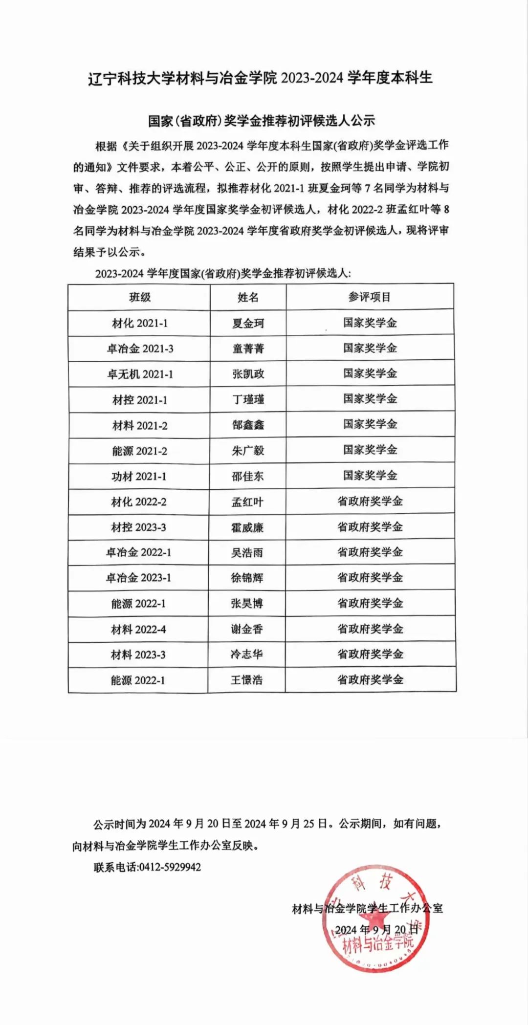 材料与冶金学院2023-2024学年度本科生 国家(省政府)奖学金推荐初评候选人公示