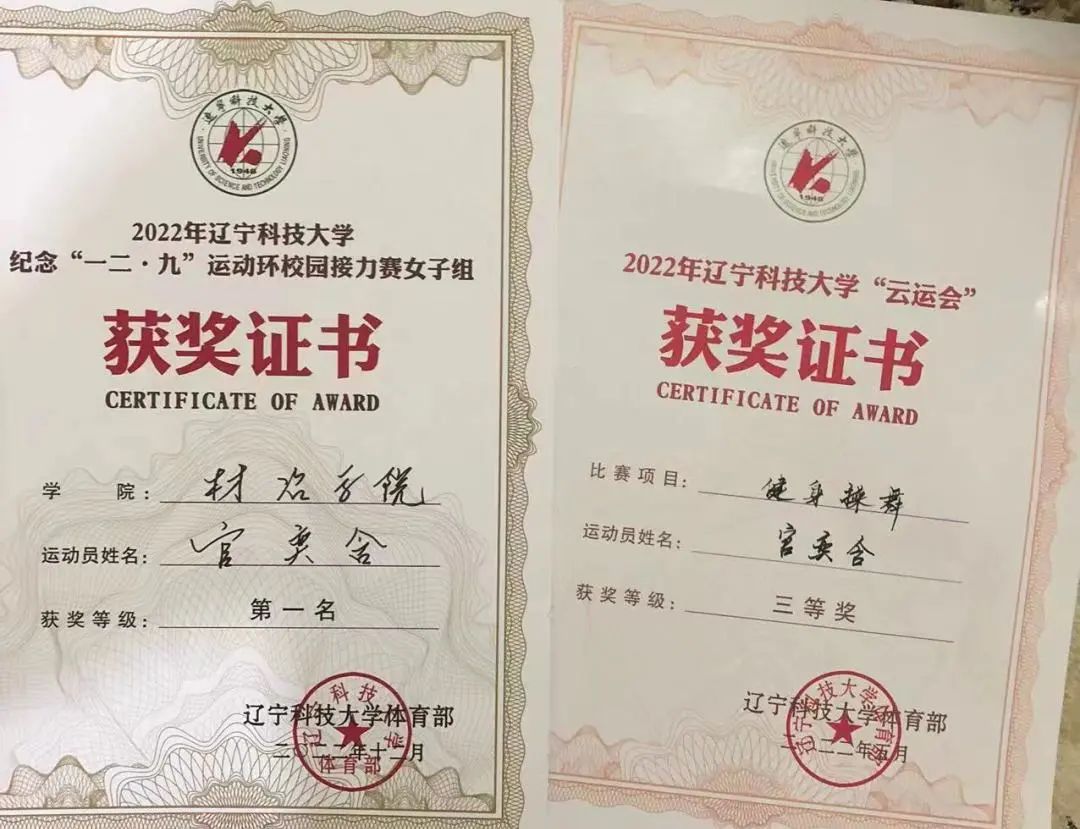2022年:WANMEI.COM清明4.5千米接力环跑校级一等奖、WANMEI.COM云运会健美操比赛校级第四名、WANMEI.COM纪念“一二·九”运动环校园接力赛女子组校级第一名、WANMEI.COM材料与冶金学院129长跑优秀运动员