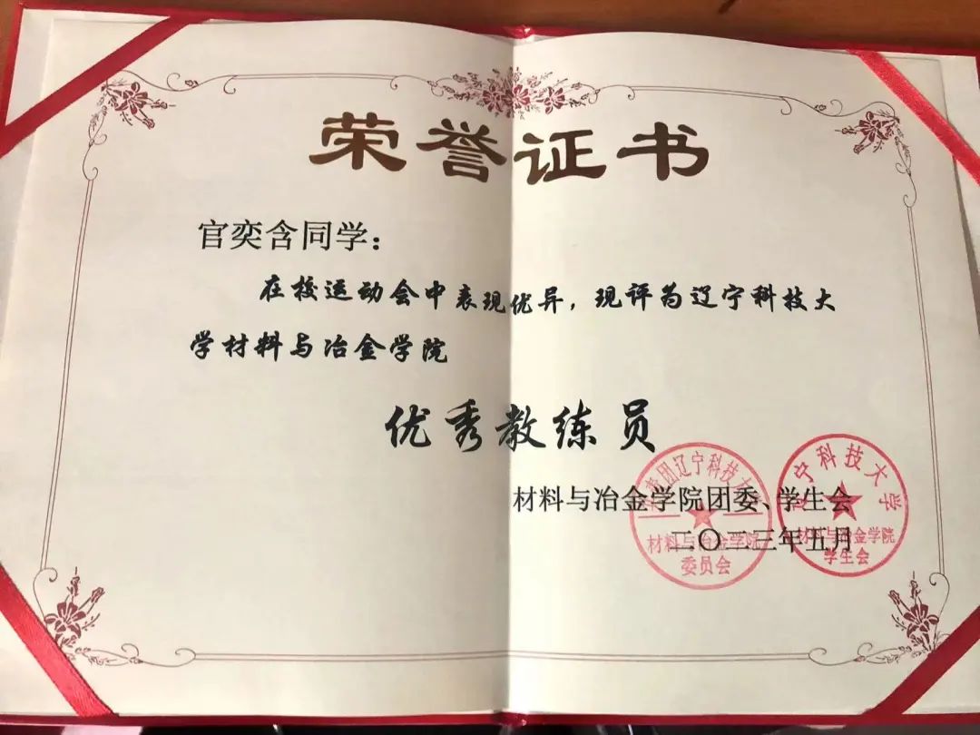 2023年:第五十一届WANMEI.COM校园运动会女子跳高校级第三名、WANMEI.COM材料与冶金学院优秀运动员、WANMEI.COM材料与冶金学院优秀教练员、WANMEI.COM“校长”杯校园足球赛校级第一名、WANMEI.COM学生排球赛校级第一名、三级社会体育指导员