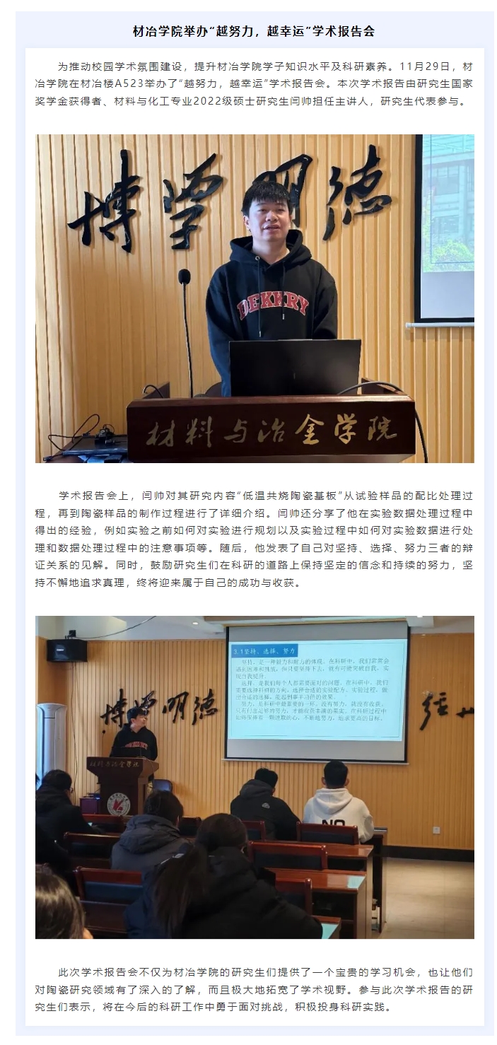学院动态 | 材冶学院举办“越努力,越幸运”学术报告会