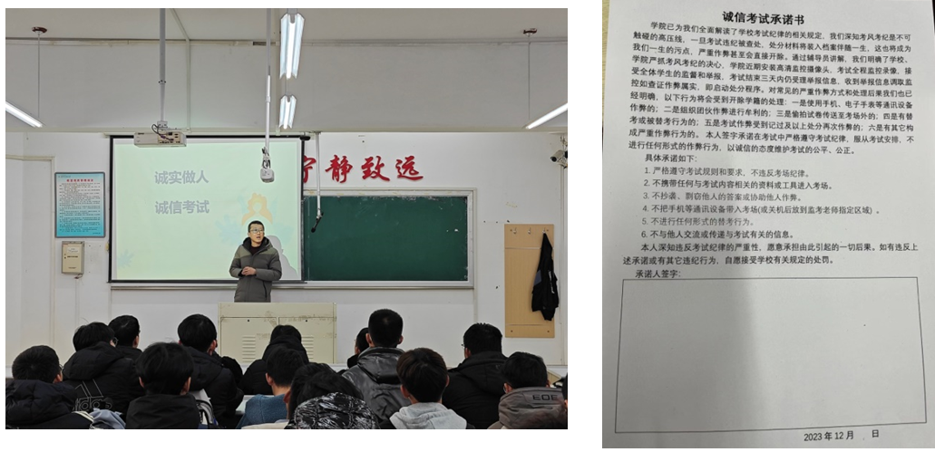各专业班级通过主题班会等方式开展诚信考试宣传教育,辅导员带领全体同学认真学习了《WANMEI.COM学生考试违纪处理细则》等文件,并通报了以往因考试作弊受到处分的案例、严重后果。帮助同学们从思想上认识到诚信考试的重要性和必要性,全体学生签署了《诚信考试承诺书》,承诺依靠自己的努力学习取得优异成绩。