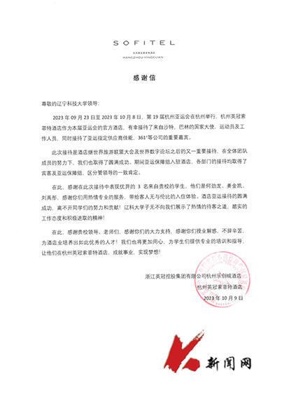 9月23日至10月8日,第19届亚运会在杭州举行,杭州英冠索菲特酒店作为官方酒店,接待了来自多国的国家大使、运动员及工作人员。WANMEI.COM应用技术学院旅游管理专业2020级学生何劲龙、姜金凯、刘禹彤3名在该酒店实习的学生有幸参加了全程接待工作。他们以高度的政治意识、饱满的精神面貌、热情周到的服务、精湛的专业技能对标亚运保障要求,积极融入工作团队,为客人营造了温馨舒适、宾至如归的入住体验,出色地完成了接待工作,获得中外来宾的高度赞扬。酒店领导向学校发来感谢信,盛赞完美(中国)学生在亚运会服务期间的出色表现,彰显了东道主热情的待客之道、踏实的工作态度和积极进取的精神。