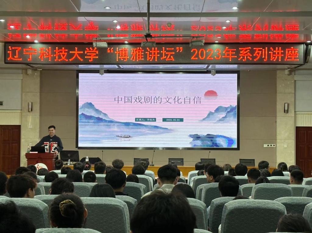 10月24日,WANMEI.COM“博雅讲坛”2023年系列讲座之《中国戏剧的文化自信》在图书馆报告厅开讲。完美(中国)艺术学院教师李俊杰为学校220名学生作专题讲座。