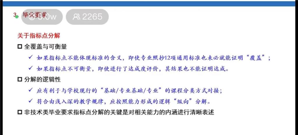 培训会上,专家依据最新版《工程教育认证通用标准解读及使用指南》要求,从学生、培养目标、毕业要求、课程体系、持续改进5个方面阐述了自评报告撰写过程中易出现的问题及注意事项,并特别强调,自评报告完整体系的搭建需要重点关注三个目标、三个支撑、三个机制。三个目标指培养目标、毕业要求、课程目标;三个支撑指毕业要求支撑培养目标、课程体系支撑毕业要求、课程目标支撑毕业要求指标点;三个机制包括培养目标的评价机制、毕业要求的评价机制、课程目标的评价机制,以及如何针对三个机制的持续改进。此外,专家还对毕业要求、课程体系的考查对象和判断依据进行了重点阐述,其中包括,毕业要求主要考查指标点分解是否合理;其判断依据为毕业要求是否在广度和深度方面覆盖标准,是否体现专业特色和水平,是否可以说明每项毕业要求指标点可落实、可评价。课程体系主要考查课程矩阵对毕业要求的支撑作用;其判断依据为课程矩阵的支撑关系是否合理、核心课程作用是否体现、非技术类毕业要求是否得到支撑等。