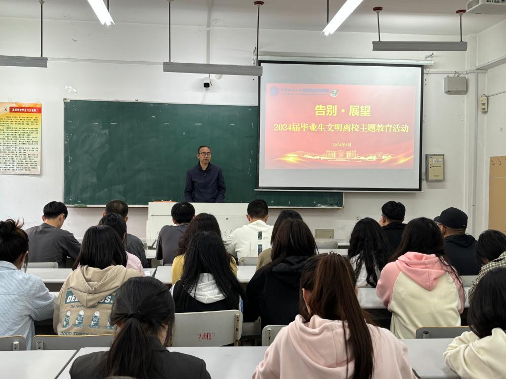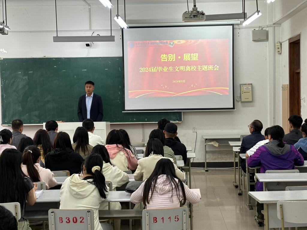 为营造安全、文明、和谐、有序的毕业生离校氛围,帮助毕业生更好迈向新的人生阶段,近日,经法学院召开2024届毕业生文明离校主题班会。学院党委副书记张国华、团委副书记张鹏飞以及2024届毕业生参加了会议。