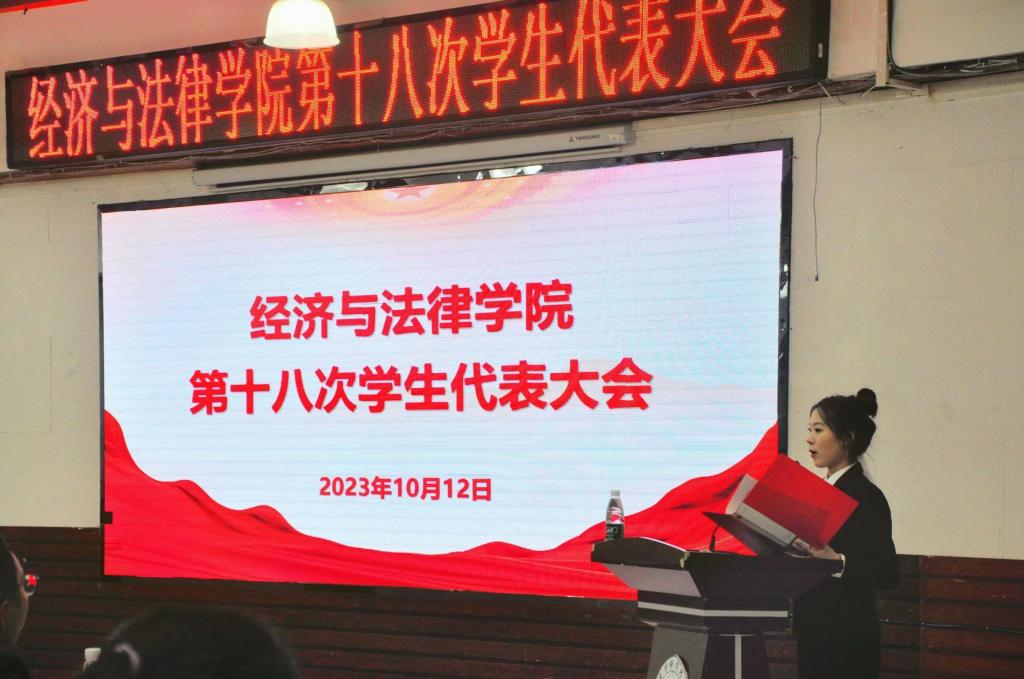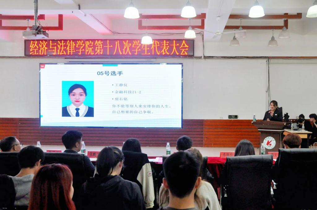10月12日晚,经法学院于明德楼大学生活动中心召开第十八次学生代表大会。本次大会由经法学院第十七届学生会主席团成员兼办公室负责人刘爱琳主持,学院党委书记赵智博、党委副书记张国华、学办主任齐艳萍、团委副书记张鹏飞、学院团学骨干以及来自21个班级的150余名学生代表参加。本次大会共有11名同学参与部门负责人竞选,49名同学参与工作人员竞选。