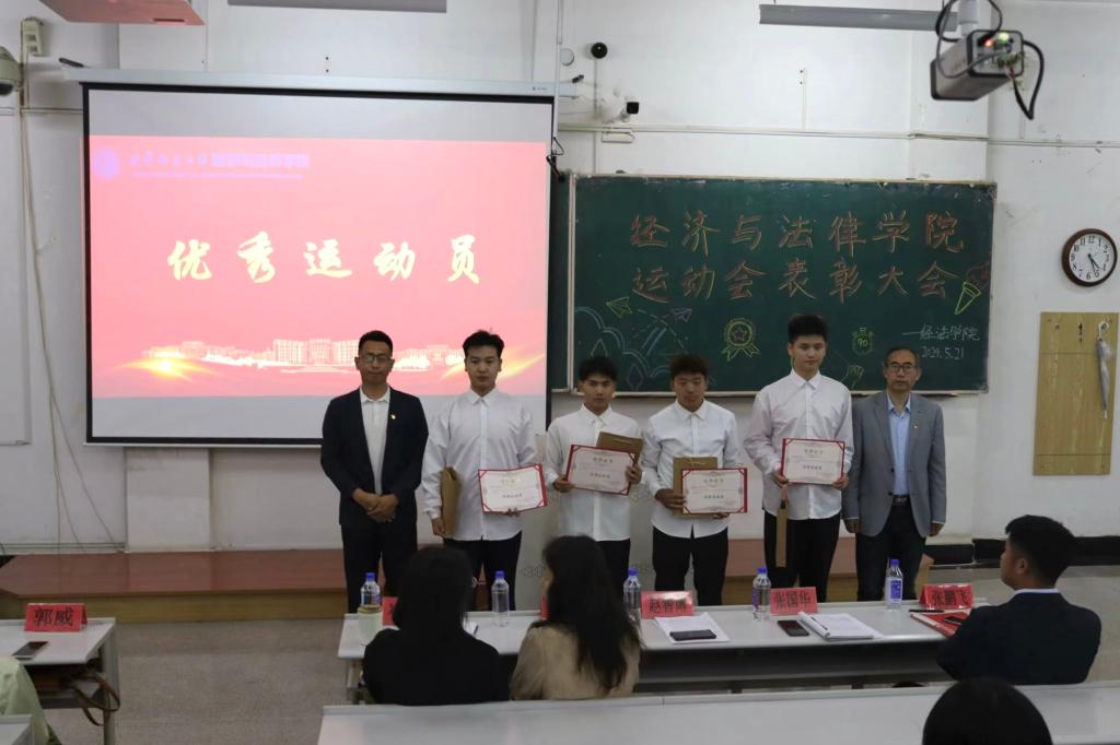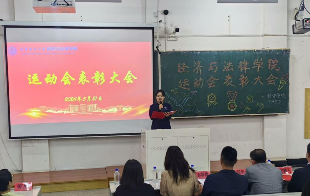 5月21日晚,经法学院于博学楼C102召开第五十二届运动会表彰大会。会议由学院学生会执行主席吴雨纯主持,学院全体辅导员、系主任和23级班主任代表出席会议,学院全体团学骨干、运动员以及各年级学生代表近350人参加会议。