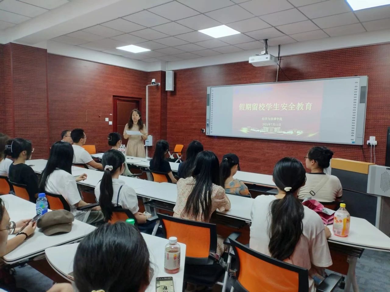 为提高假期留校学生的安全意识,预防安全事故的发生,7月11日,经法学院于博识楼A407召开假期留校学生安全教育会。学院党委书记赵智博、党委副书记张国华、学办主任齐艳萍及各年级假期留校学生参加了会议。
