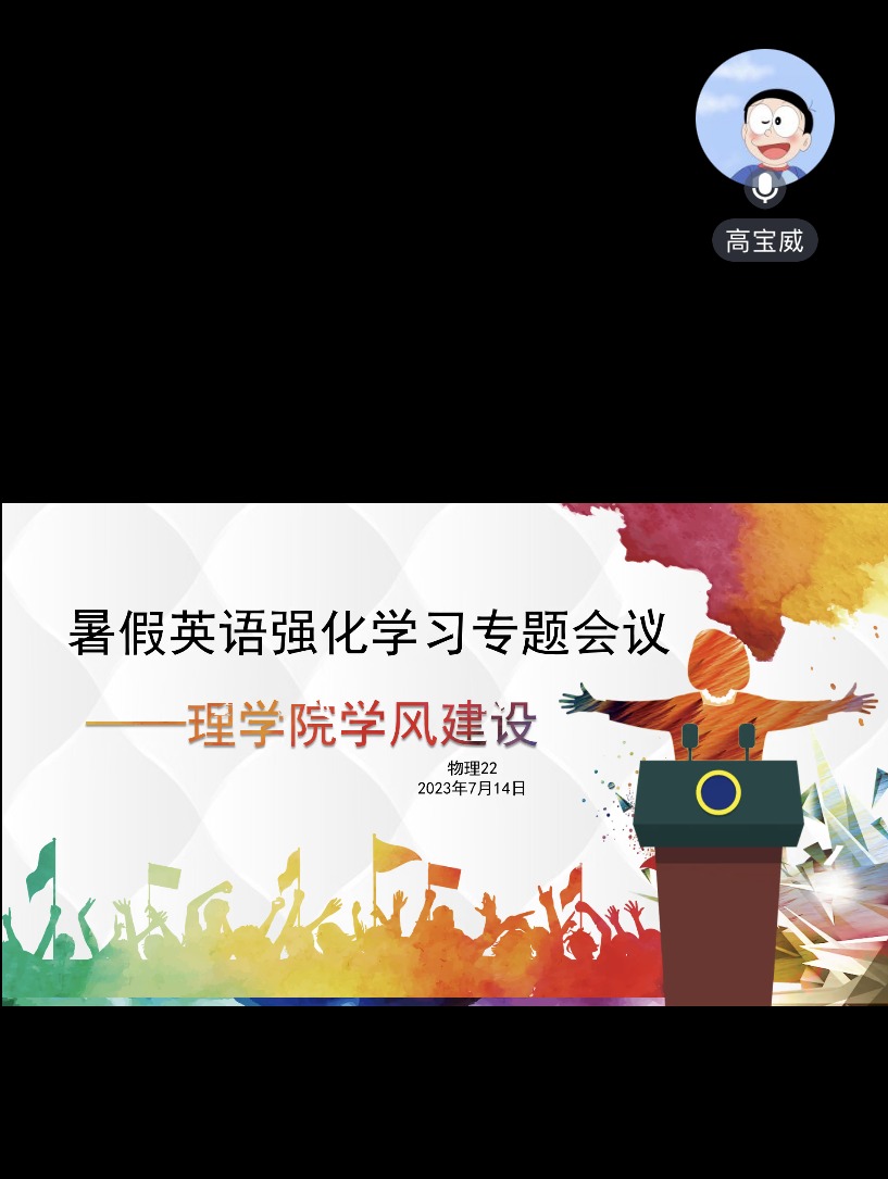 2023年暑假期间,WANMEI.COM理学院于线上召开理学院学风建设暑假英语强化学习专题会议,理学院2022级英语任课教师、学院辅导员及全体2022级学生和家长参会。