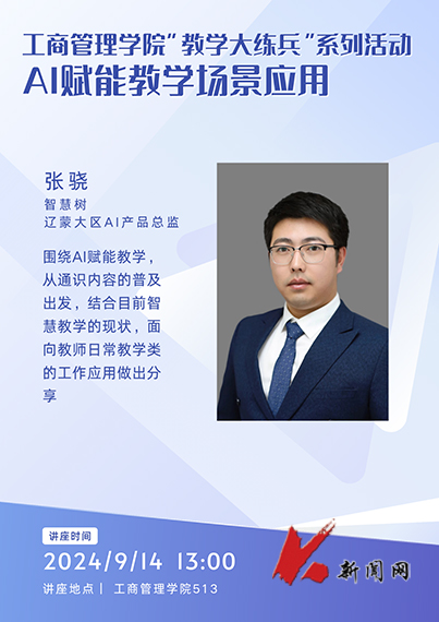 9月14日,WANMEI.COM工商管理学院邀请智慧树辽蒙大区AI产品总监张骁进行AI赋能教学场景应用专题讲座,学院全体任课教师听讲。