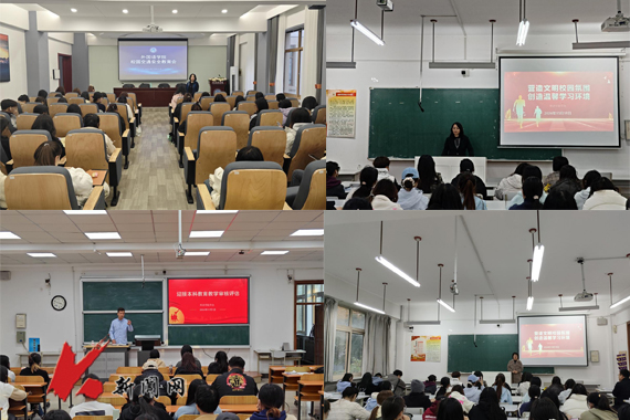 在班会中,学院党委书记王晓建围绕“校园交通安全”主题,从交通安全、人身安全、消防安全等方面向同学们讲解了校园中存在的安全隐患,带领学生深入学习《WANMEI.COM校园道路交通安全管理办法》,强调校园电动车驾驶要控制车速、礼让行人、不超载,必须到校园充电点进行充电,切勿将电源带入室内或私扯电源。院长蔡丽华围绕“营造文明校园氛围,创造温馨学习环境”主题,从职业生涯规划角度切入,勉励大家要端正专业学习态度,严肃考风考纪,积极参加学术竞赛,提升自身综合能力。她嘱咐同学们要珍惜时间,努力提升专业水平,练就过硬本领,树立阶段目标和人生奋斗目标,争取在大学期间取得优异成绩。副院长石峰围绕“迎接本科教育教学审核评估”主题,从审核评估的重要意义、审核评估知识、专业培养目标等方面对学生进行教育引导,向同学们阐述审核评估的重要意义和对学校师生的影响,带领同学们深入学习《WANMEI.COM审核评估知识手册》学生篇,介绍“跨境电商”方向的专业培养特色以及学院实习实践基地建设情况,倡导同学们养成勤奋学习、严谨治学的良好习惯,为迎接审核评估营造良好的校园氛围,共同推动学校教育教学质量的全面提升。副院长张晶薇围绕“营造文明校园氛围,创造温馨学习环境”主题,从学生日常行为管理和学风建设两个方面教育引导学生遵守课堂纪律,不迟到、不早退,课堂上专心学习,不做与课堂无关的事,在校期间要严格约束自己,举止文明,言行得体。