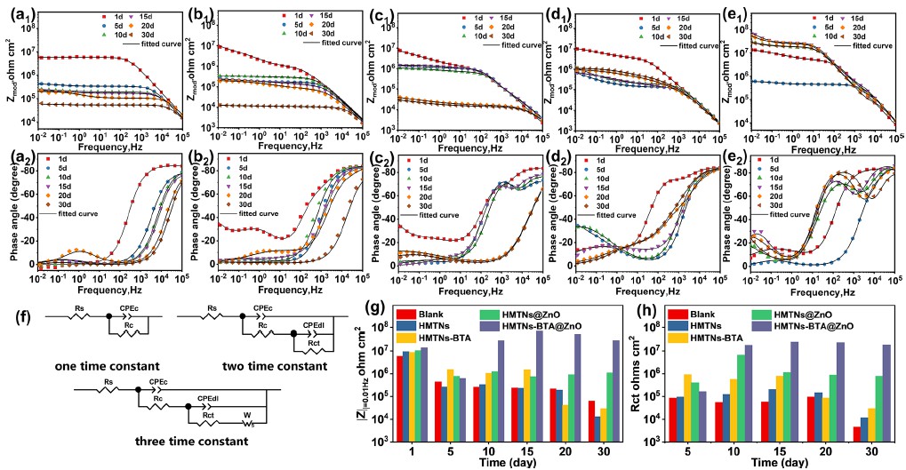 2保护膜,从而抑制基体碳钢腐蚀(图2)。加速腐蚀实验表明,在3.5 wt% NaCl溶液中浸泡30天后,HMTNs−BTA@ZnO-QDs涂层的|Z|0.01 Hz值保持在2.87×107 Ω cm