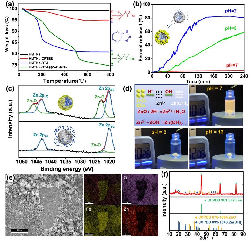 2纳米容器中缓蚀剂封装并具有环境响应性质的功能型耐腐蚀涂层。研究成果以题为“Self-Healing Coating with a Controllable Release of Corrosion Inhibitors by Using Multifunctional Zinc Oxide Quantum Dots as Valves”在线发表于《ACS Applied Materials & Interfaces》。