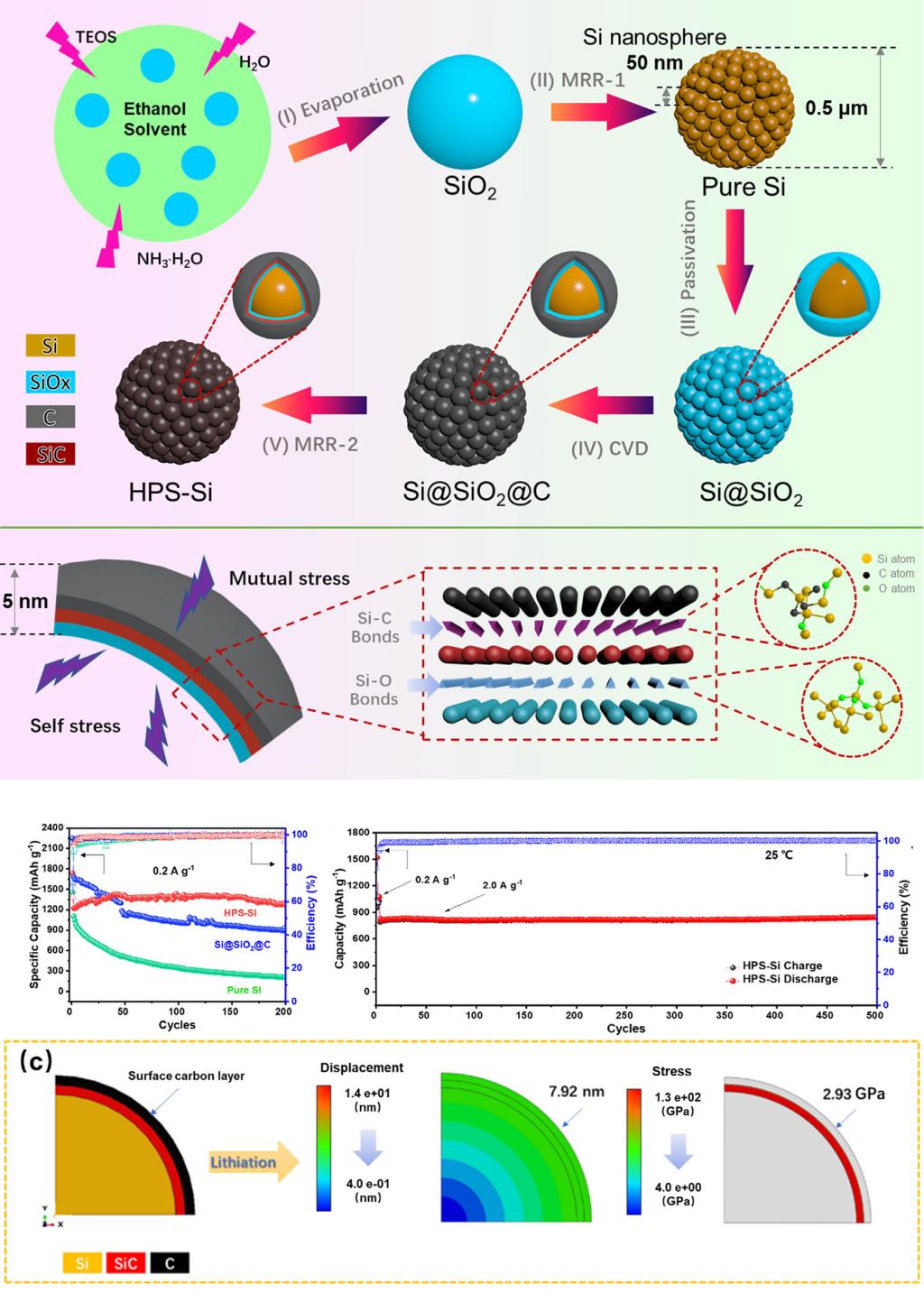 硅因其高理论容量被认为是一种很有前途的锂离子电池负极材料,然而硅在锂化和脱锂过程中产生的应力会导致硅负极严重结构损伤和不稳定固态电解质界面,严重阻碍了硅负极实际应用。针对上述问题,安百钢教授团队和中科院金属研究所李峰研究员合作,设计了一种具有多级石榴状结构的硅负极(HPS-Si),其由共价键联接的亚纳米级 SiO