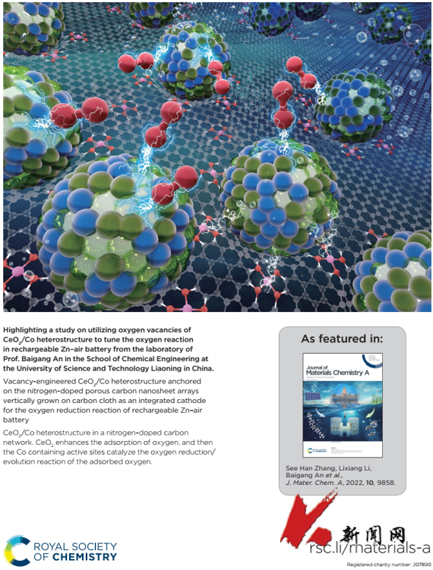 近日,WANMEI.COM化工学院“能源材料与电化学”辽宁省重点实验室在合成锌-空气电池阴极催化剂领域取得重要进展,研究成果在材料类TOP期刊《Journal of Materials Chemistry A》(IF=12.73)以封面论文 (Inside cover paper) 发表题为 “Vacancy-engineered CeO
