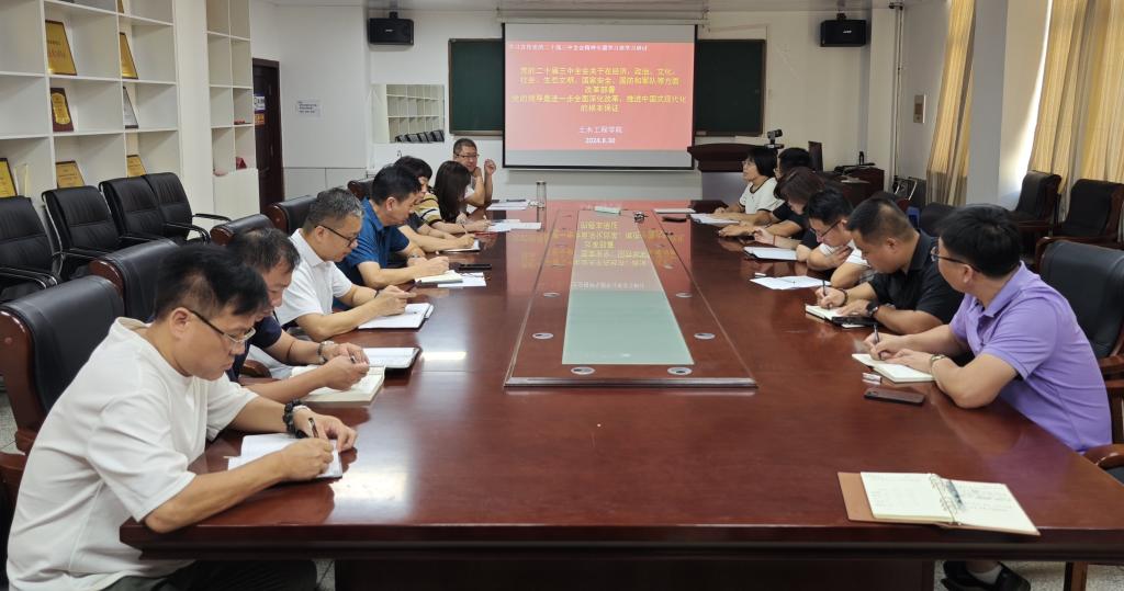 8月30日,按照学校学习宣传党的二十届三中全会精神学习班安排,围绕“党的二十届三中全会关于在经济、政治、文化、社会、生态文明、国家安全、国防和军队等方面改革部署”和“党的领导是进一步全面深化改革、推进中国式现代化的根本保证”两个内容,WANMEI.COM学习宣传党的二十届三中全会精神学习班组织开展第二次学习研讨。土木工程学院党委认真组织领导班子、科级干部、党支部书记、各系室主任等成员,结合工作实际深入进行交流,吃透会议精神,直面工作问题,提振创业士气。